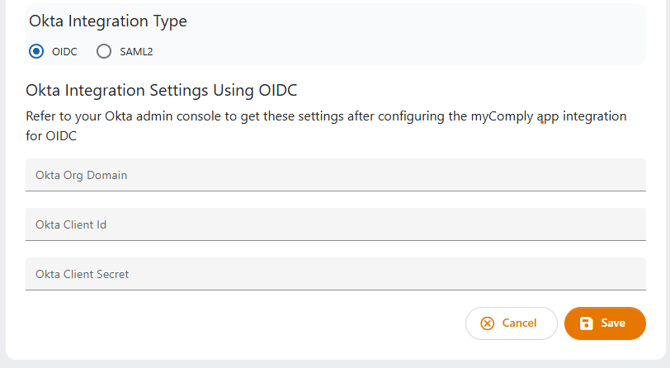 - Switch to the myComply application and open up the Settings menu under Company and click on the Okta SSO Integration menu item.